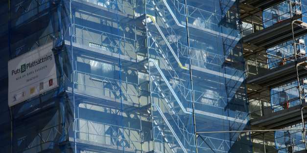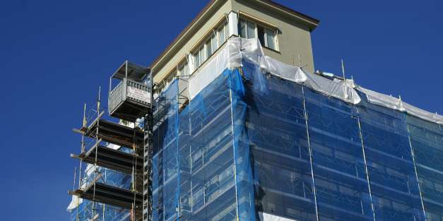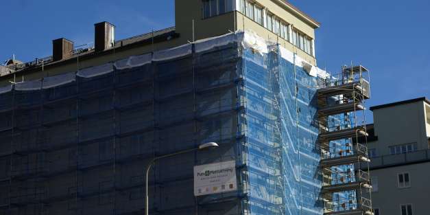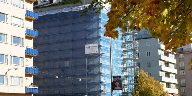Omgjutning av balkonger, altaner och takfötter. Putsrenovering och avfärgning med kalkcementfärg inkl. byte av alla fönsterbleck.