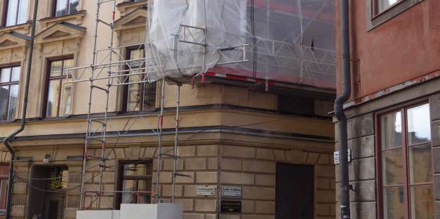 Vi har fått i uppdrag av Pauliska Donationsfonden att i 3 etapper renovera deras fastighets fasader i Gamla Stan. För övrigt den största fastigheten i Gamla Stan näst Slottet. Fasaderna är helt uttjänta, dels av tidens tand men framför allt av sentida felaktiga behandlingar (läs plastfärg). Så all puts måste ner och tegelstommen kompleteras. Därefter återskapar vi en tidsenlig fasad både vad gäller utseende och material. Även fönster och snickerier genomgår en totalrenovering.