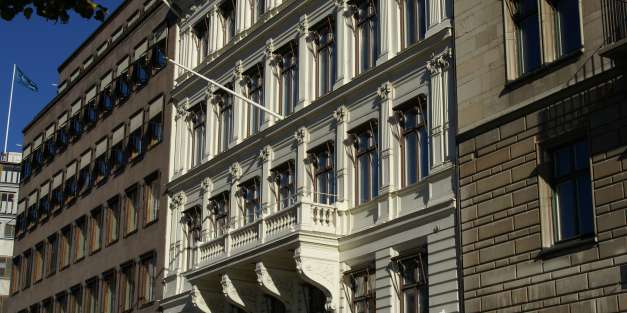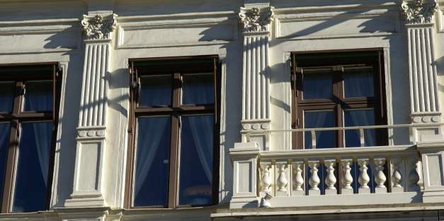 Borttagning av felaktig plastfärg på fasaden. Renovering av puts och stukaturutsmyckningar. Varefter hela fasden målats med linoljefärg.