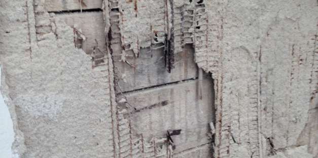 Nedbilning av befintlig puts in till trästommen. Montering av papp, vassmatta och ny kalkputs avfärgad med kalklimfärg. Nytt montage av ny gipsstuckatur