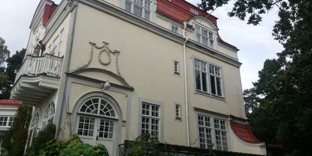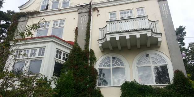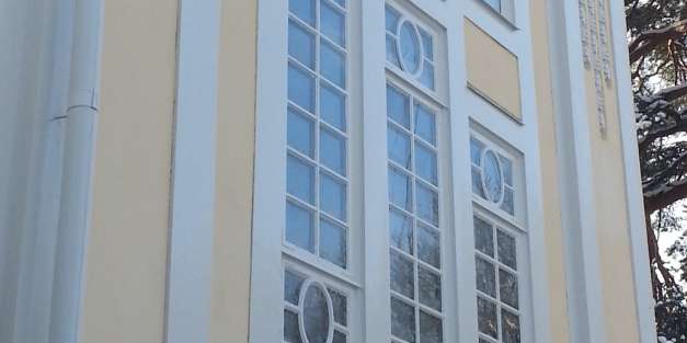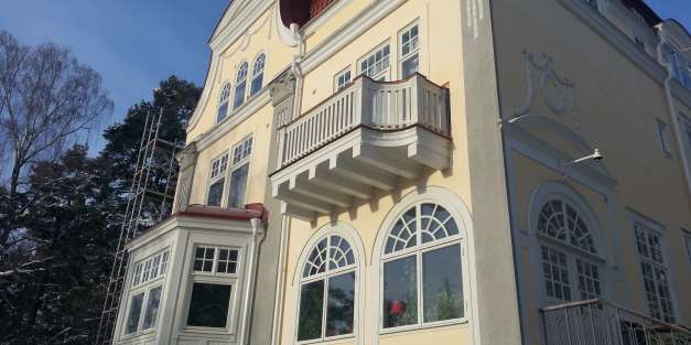 Ytavblästring av felaktig plastfärg, upplagning av underliggande kalkputs. Ny ytputs med luftkalkbruk som avfärgas med Kulturkalkfärg. All plåt och trä i fasad målas med oljefärg.