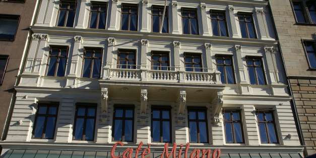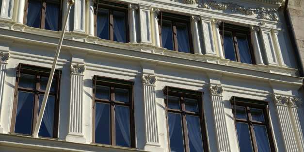 Borttagning av felaktig plastfärg på fasaden. Renovering av puts och stukaturutsmyckningar. Varefter hela fasden målats med linoljefärg.